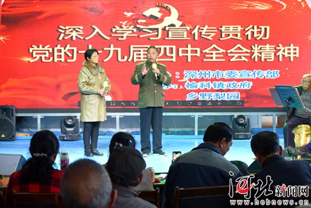 11月13日,深州市鄉(xiāng)野梨園文化大院舉行深入學習宣傳貫徹黨的十九屆四中全會精神主題文藝匯演。記者焦磊 通訊員高占峰攝