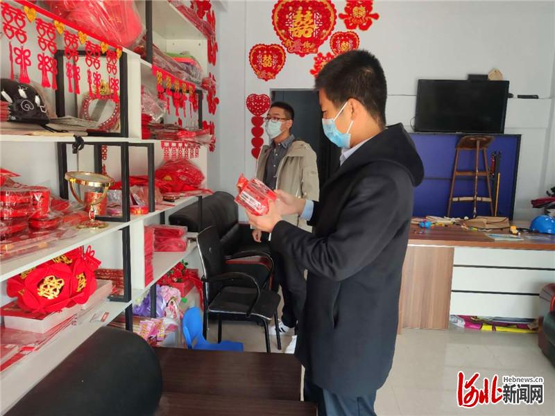 衡水市市場(chǎng)監(jiān)督管理局濱湖新區(qū)分局執(zhí)法人員對(duì)轄區(qū)內(nèi)一婚慶用品商店商品進(jìn)行檢查。尹丹陽(yáng)攝