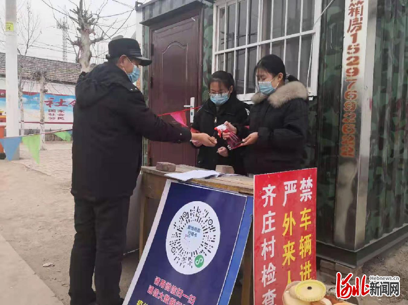 圖為故城縣鄭口鎮(zhèn)齊莊村疫情檢查站工作人員對出入村人員進行體溫測量。馬曉彤攝