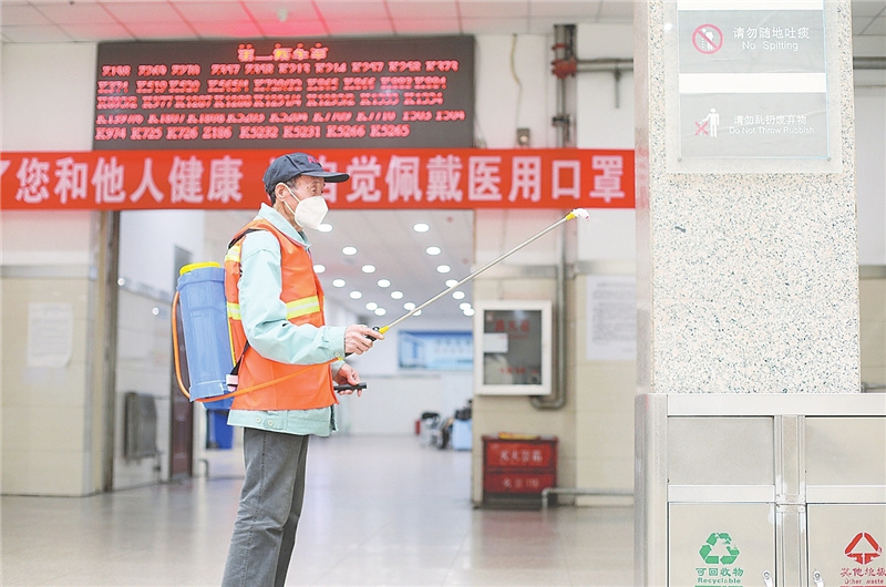 日前,為做好疫情防控工作,確保春運安全有序,河北衡水火車站進一步加強疫情常態(tài)化防控措施,嚴格旅客進出站檢測查驗,加大加密車站公共區(qū)域預(yù)防性消毒力度和頻次,建立突發(fā)情況應(yīng)對機制,落實車站職工健康管理和疫情防控措施,全力做好疫情防控和鐵路運輸安全工作。圖為衡水火車站有關(guān)人員正在對候車室進行全面消殺。袁占 、陳康攝影報道