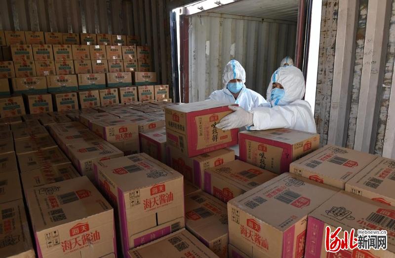 1月23日,在深州安華國際物流園,工作人員在搬運中轉(zhuǎn)調(diào)運的應急物資。河北日報通訊員高占峰 攝