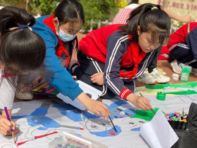 畫說黨史,童心向黨。黨史主題教育課后,孩子們便迫不及待地拿起畫筆,寄情于畫,將對黨和國家的熱愛執(zhí)于筆下,有序地在百米畫卷上畫了起來。“我畫的是八路軍”“我畫的是紅軍長征的故事”“我畫的是五星紅旗”……學(xué)生們席地而坐,一邊交談著,一邊在校美術(shù)老師的指導(dǎo)下,用畫筆畫出自己腦海中的紅色故事。
