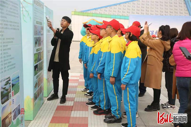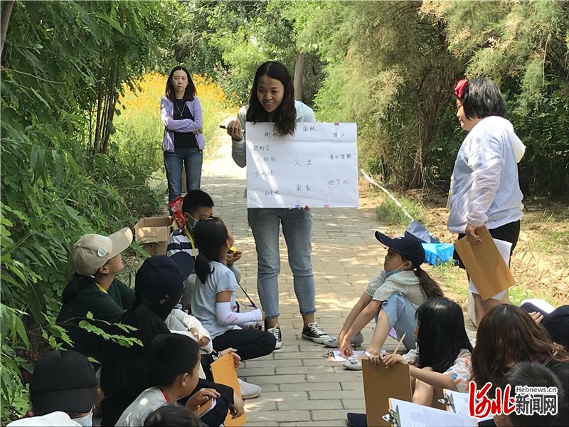 近日,在衡水湖畔,衡水湖國(guó)家級(jí)自然保護(hù)區(qū)自然體驗(yàn)引導(dǎo)員為孩子們講解生態(tài)環(huán)境保護(hù)常識(shí)。 通訊員吳軍梅攝