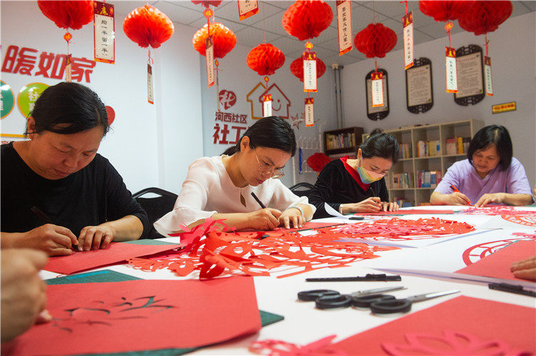 9月26日,在河北省棗強縣河西社區(qū),黨員干部和居民共同制作廉政剪紙作品。