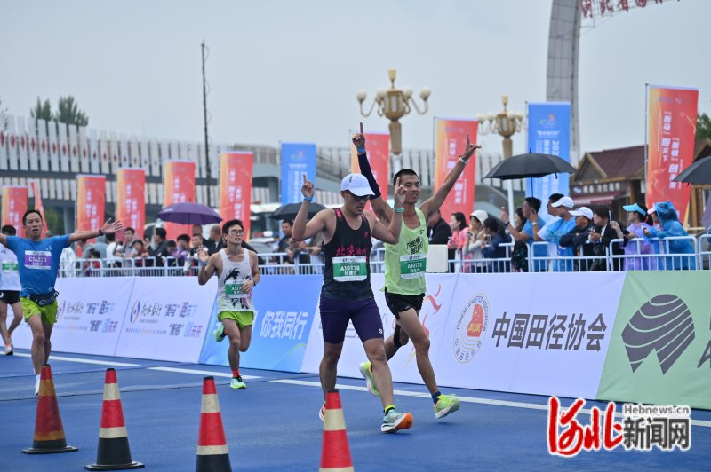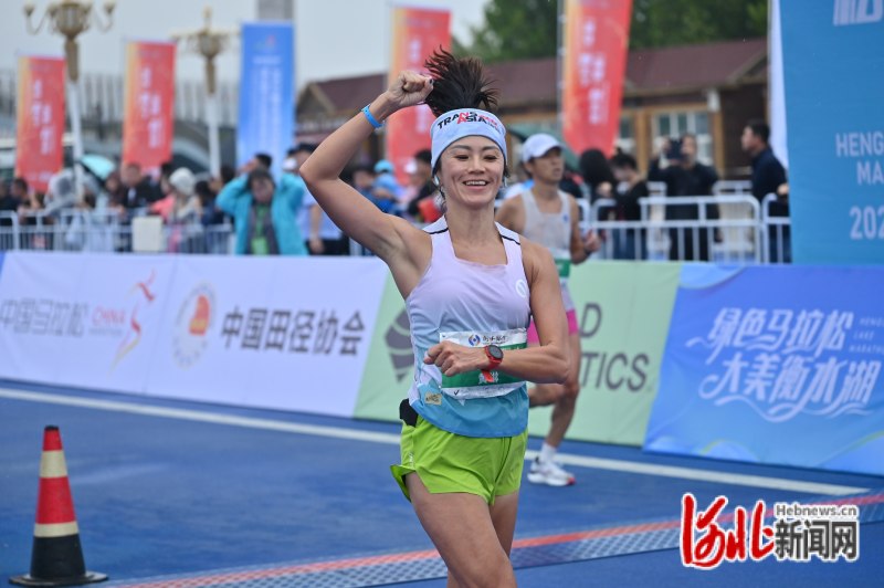 2023衡水湖馬拉松賽暨全國馬拉松錦標賽(第三站)上,參賽選手通過終點時興奮地舉手歡呼。河北日報記者焦磊攝