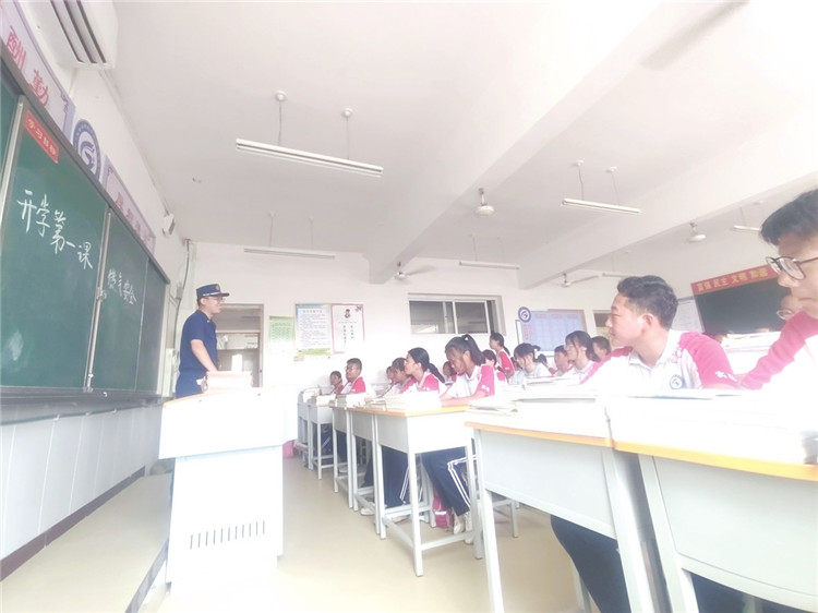 消防宣傳員在“開(kāi)學(xué)第一課”上宣講消防安全知識(shí)。
