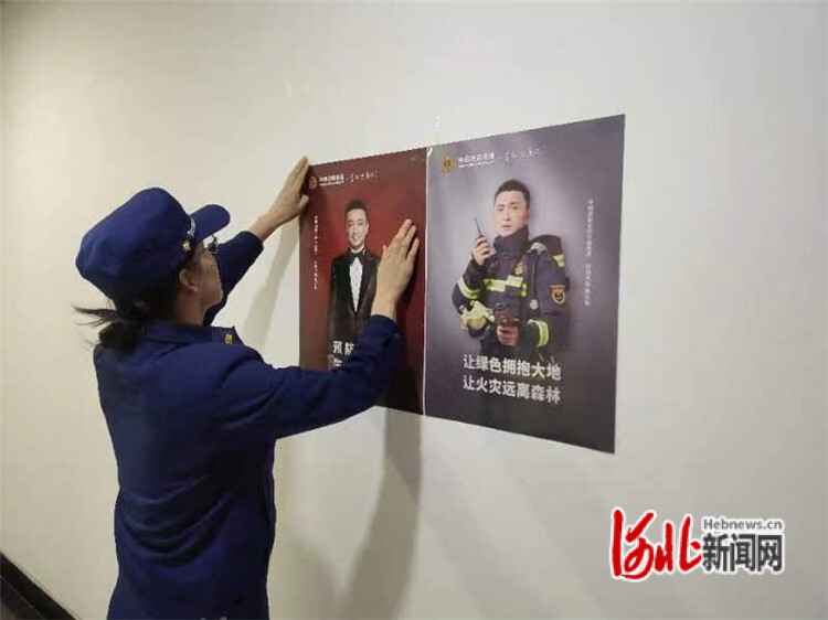 圖為衡水市阜城縣消防救援大隊(duì)工作人員在公共場所張貼消防宣傳海報(bào)。李鑫攝