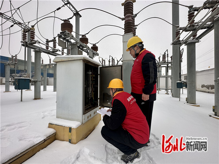 圖為國(guó)網(wǎng)安平縣供電公司變電運(yùn)維班工作人員對(duì)電力設(shè)備進(jìn)行雪后特巡。張猛攝