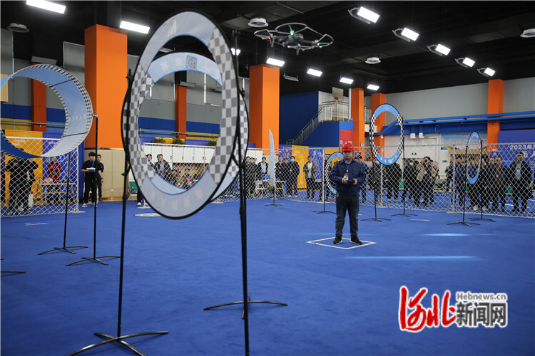 圖為國網(wǎng)衡水供電公司輸電運檢中心職工時洪剛在無人機飛行比賽現(xiàn)場操縱無人機穿越障礙物。