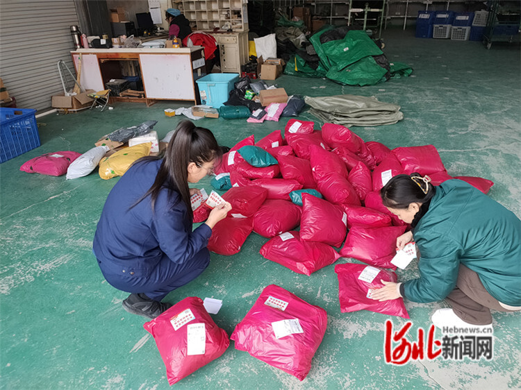 圖為快遞工作人員在包裹上粘貼消防安全提示小貼紙。