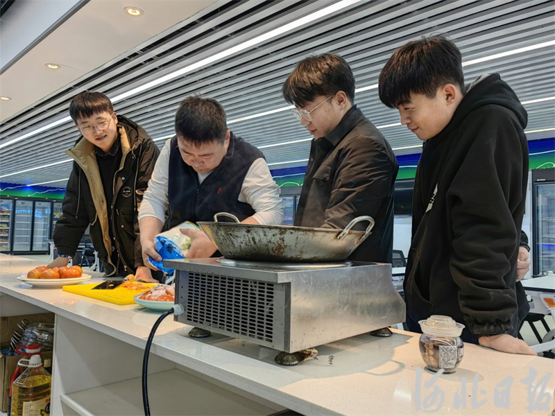 2月9日下午,在位于北京市豐臺區(qū)的“河北凈菜”共享倉儲統(tǒng)配中心展廳,河北農(nóng)速源冷鏈物流有限公司總經(jīng)理邢永志(左二)和員工們一起做年夜飯。河北日報記者馮陽攝