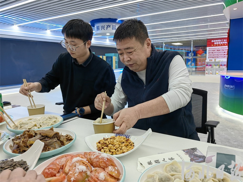 飯桌上有從倉庫拿來的蘋果、橘子,煮好的速凍餃子,還有剛買來的飲料、瓜子,一盤糖拌西紅柿成了最“費刀功”的一道菜!拔骷t柿你可得嘗嘗,都產(chǎn)自衡水,名副其實的‘河北凈菜’!毙嫌乐菊泻粲浾吲c他們一道坐下。