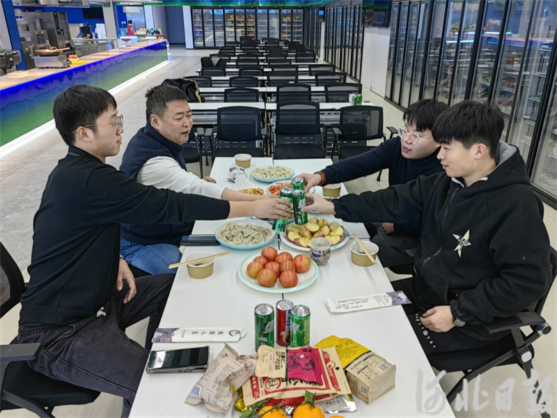 2月9日下午,在位于北京市豐臺區(qū)的“河北凈菜”共享倉儲統(tǒng)配中心展廳,河北農(nóng)速源冷鏈物流有限公司總經(jīng)理邢永志(左二)和員工們一起吃年夜飯。河北日報記者馮陽攝