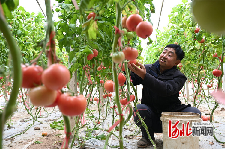 1月30日,饒陽(yáng)縣留楚鎮(zhèn)北空城村紅響種植家庭農(nóng)場(chǎng),蔬菜種植戶(hù)宋長(zhǎng)江在棚室內(nèi)采摘西紅柿。河北日?qǐng)?bào)記者焦磊攝