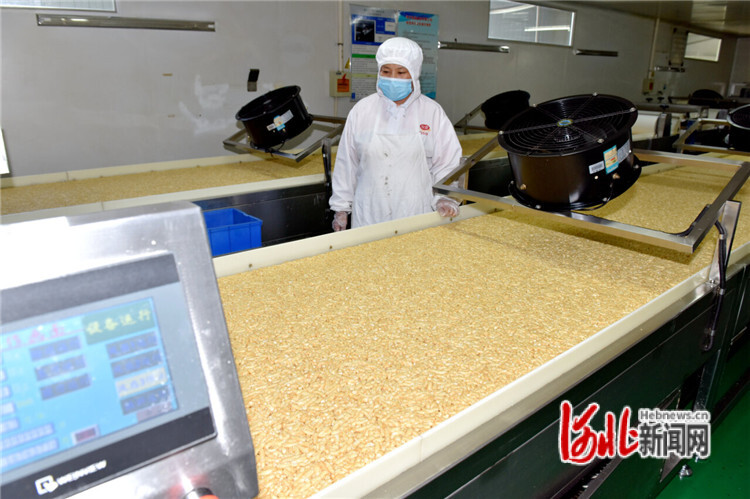 3月7日,在位于阜城縣北京·中華老字號食品產(chǎn)業(yè)園內(nèi)的河北雙榮食品有限公司車間內(nèi),工人在沙琪瑪生產(chǎn)線查看產(chǎn)品定型情況。河北日報通訊員苗鳳強攝