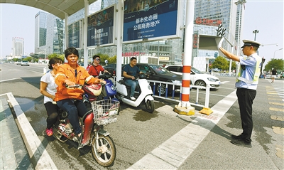 “您好,此路段不能停車,請盡快駛離!”執(zhí)勤交警張雙寬對停靠在銀河北路人行道的轎車車主說。7月16日下午2點30分,正值伏天最熱的時段,他和隊員已經(jīng)行駛在執(zhí)勤的路上。從銀河北路、迎春路、文明路,到永豐道,一個半小時的時間,開出了27張違停罰單!澳懿荒芡ㄈ谝幌拢俊薄安豢梢,罰款扣分是手段,目的就是要讓車主提高自覺遵守交通秩序的意識!睆堧p寬回答。