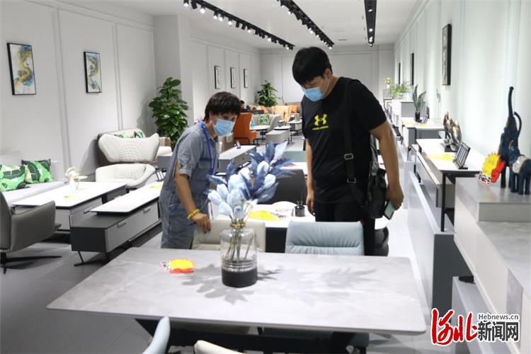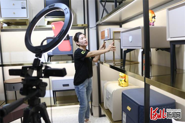 第24屆中國(guó)(勝芳)全球特色定制家具國(guó)際博覽會(huì)上,商家通過(guò)網(wǎng)絡(luò)“直播帶貨”。 通訊員邢亞南攝