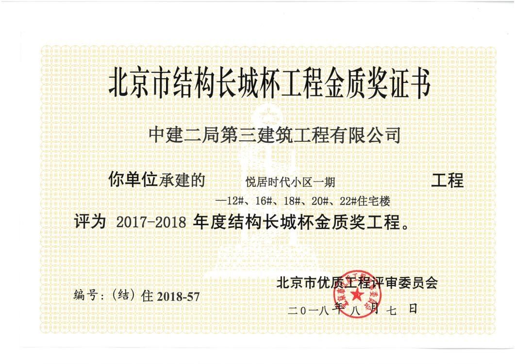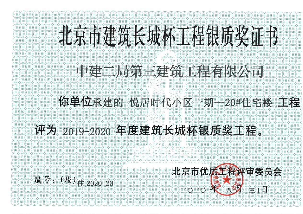 由中建二局第三建筑工程有限公司承建的廊坊悅居時代小區(qū)項目20#住宅樓,在歷經(jīng)兩年多緊張有序的施工建設(shè)后,喜獲由北京市優(yōu)質(zhì)工程評審委員會頒發(fā)的“2019-2020年度建筑長城杯銀質(zhì)獎”,這是繼該工程榮獲“2017-2018年度結(jié)構(gòu)長城杯金質(zhì)獎”后,再次榮獲建筑長城杯殊榮。