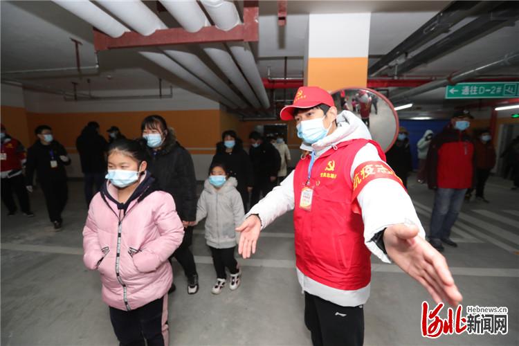 固安縣黨員志愿者組織居民有序排隊進行核酸檢測。