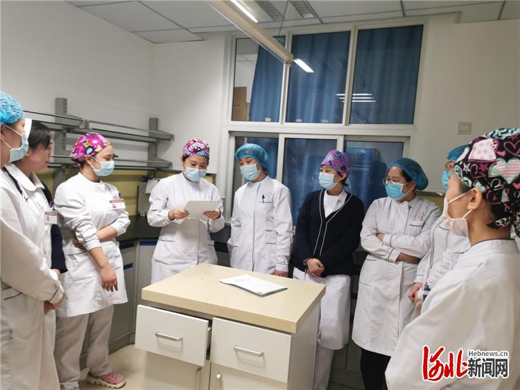 固安縣總醫(yī)院護士長肖永紅(左五)出發(fā)去抗疫一線前與同事交接工作。