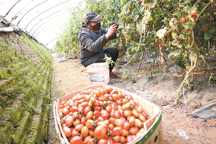 潤寶農(nóng)業(yè)基地內(nèi),工人在采摘成熟的千禧小番茄。