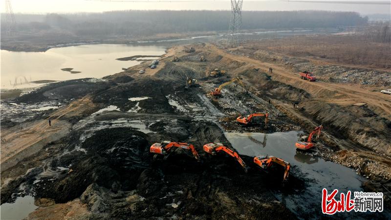香河縣北運河旅游通航施工現(xiàn)場,工程機械有序作業(yè)。