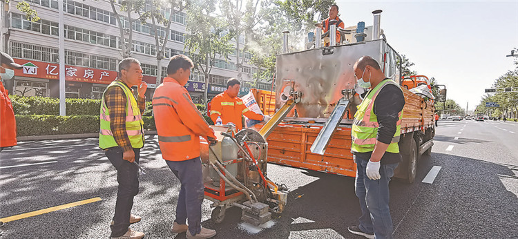 工人們正在進(jìn)行交通標(biāo)線施工。記者呂新穎攝