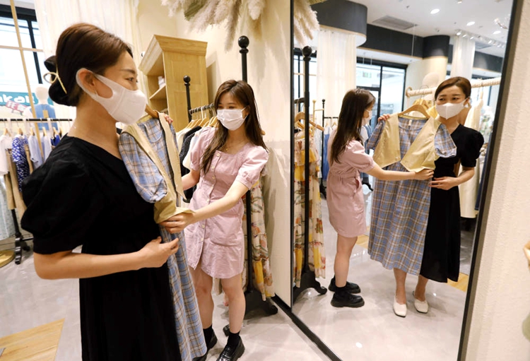 6月6日在永定城·京津冀固安國(guó)際商貿(mào)城,一名店員向顧客介紹服裝。新華社記者駱學(xué)峰攝