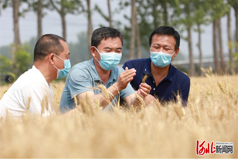 6月17日,在大廠回族自治縣梁莊村,農(nóng)技專家對(duì)小麥進(jìn)行田間收獲管理指導(dǎo)。 通訊員劉亮攝