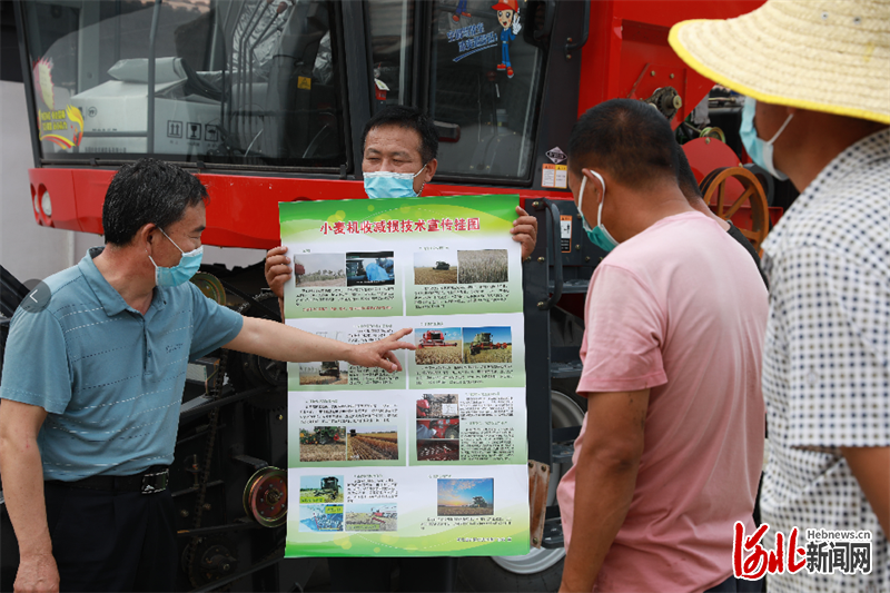 6月17日,在大廠回族自治縣梁莊村,農(nóng)技專家在對(duì)小麥聯(lián)合收割機(jī)駕駛員進(jìn)行收割技術(shù)指導(dǎo)。 通訊員劉亮攝