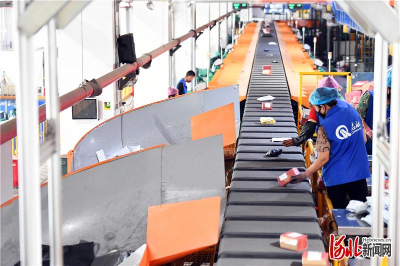 圖為中國郵政速遞物流股份有限公司環(huán)渤海郵件集散中心,工作人員將包裝好的郵件放到自動分揀設(shè)備。 通訊員孫寶宇攝