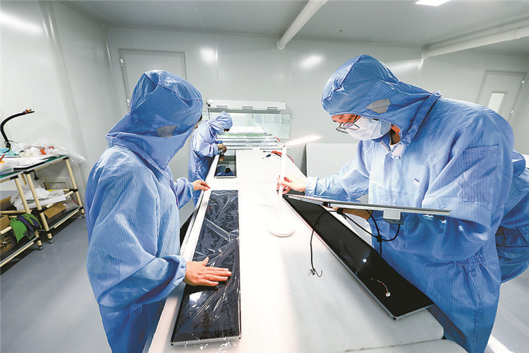 圖為在香河縣機器人小鎮(zhèn)專顯(河北)科技有限公司內(nèi)的無塵車間,技術工人正在檢查屏幕內(nèi)灰塵狀況。