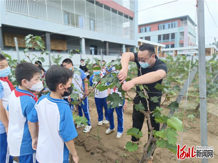 圖為三河市第九小學學生學習葡萄秧剪枝技術(shù)。