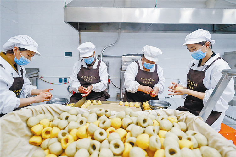 圖為在里坦鎮(zhèn)薛家窩頭非遺體驗(yàn)館生產(chǎn)車間內(nèi),工作人員在制作窩頭。記者陳童攝