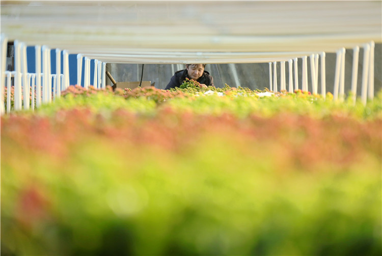 12月20日,固安縣門鐵營村花農(nóng)在大棚內(nèi)管護花卉。