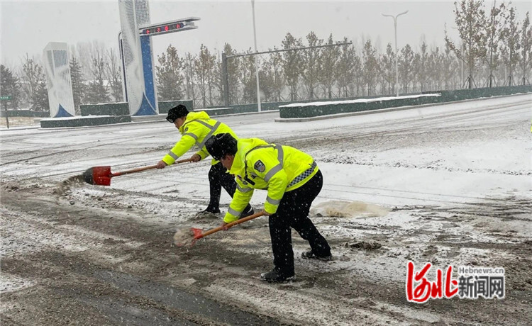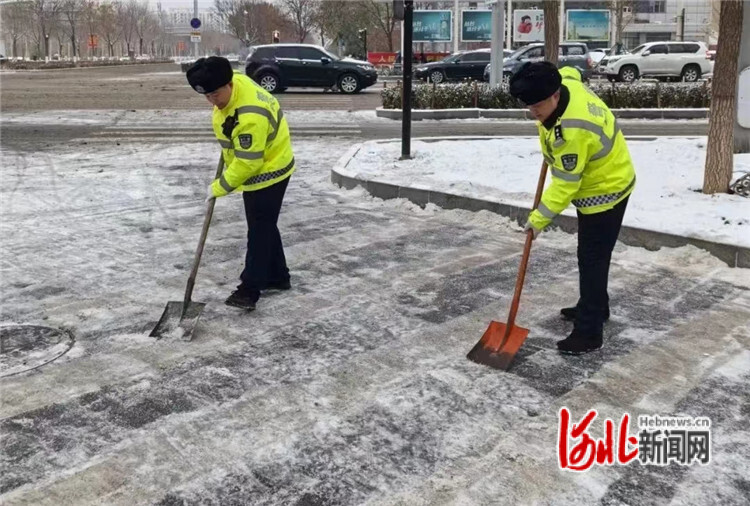 12月14日早上8時20分左右,廊坊市交警一大隊執(zhí)勤交警在廣陽道與和平路交口清除道路積雪,為群眾出行保駕護航。廊坊市公安局交通警察支隊供圖