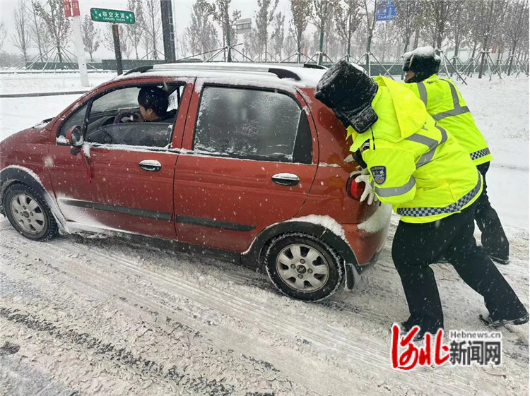 12月14日,臨空交警在臨空大道發(fā)現(xiàn)打滑車輛,幫助車主推車。廊坊市公安局交通警察支隊供圖