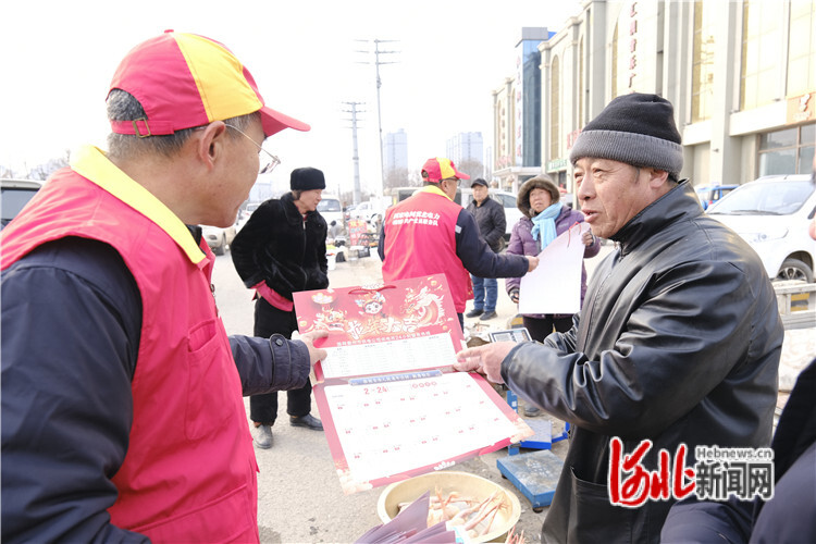 2月7日,在霸州市北楊莊橋集市上,國(guó)網(wǎng)霸州市供電公司工作人員將安全日歷送到群眾手中。