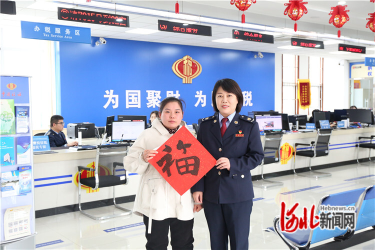 廊坊開發(fā)區(qū)稅務(wù)局黨委書記、局長王靜為前來辦稅的納稅人送福字。
