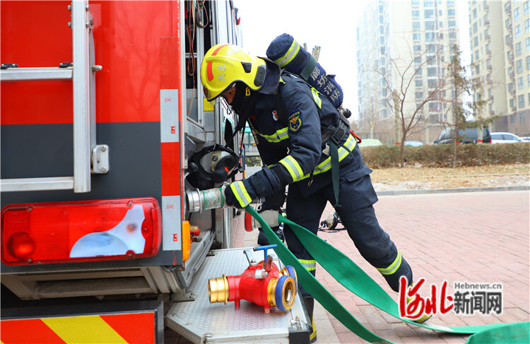 圖為1月30日,在固安縣鳳凰城小區(qū),消防員正在鋪設(shè)一條供水干線,為內(nèi)攻組供水。