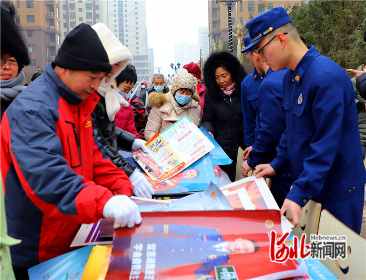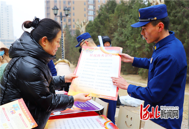 圖為1月30日,在固安縣鳳凰城小區(qū),消防員正在發(fā)放宣傳資料。