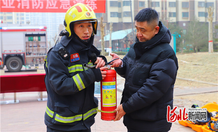 圖為1月30日,在固安縣鳳凰城小區(qū),消防員正在講解干粉滅火器的正確使用方法。