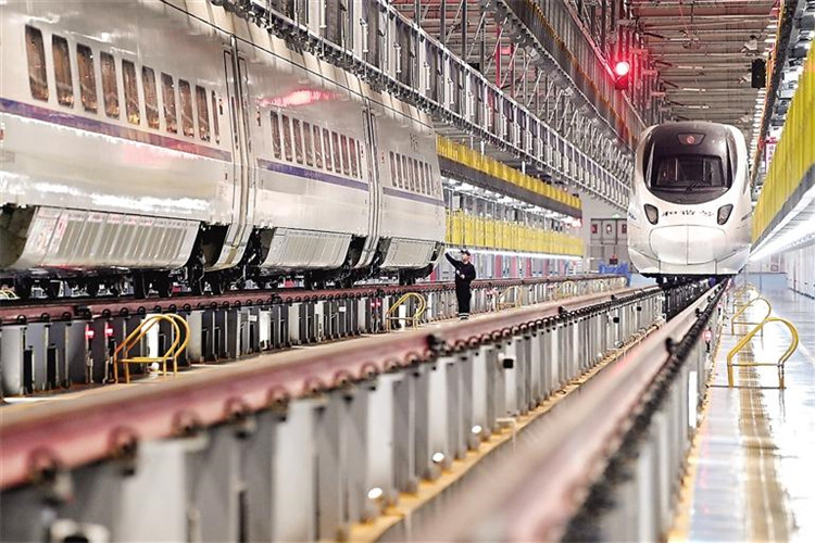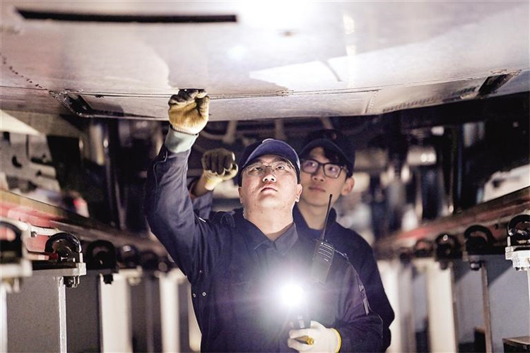 1月30日,大廠回族自治縣的動車運用所,動車機械師站在檢修地溝中查看動車底部零件狀況。記者劉向攝