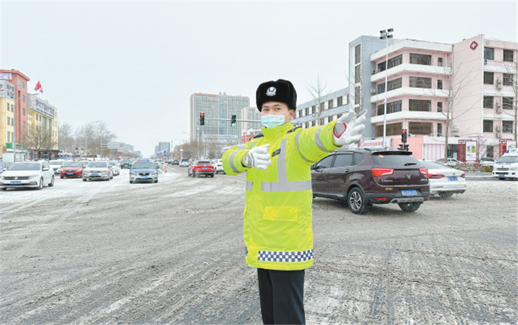 圖為交警在路口指揮交通。記者李新苓通訊員王志強(qiáng)攝