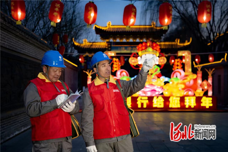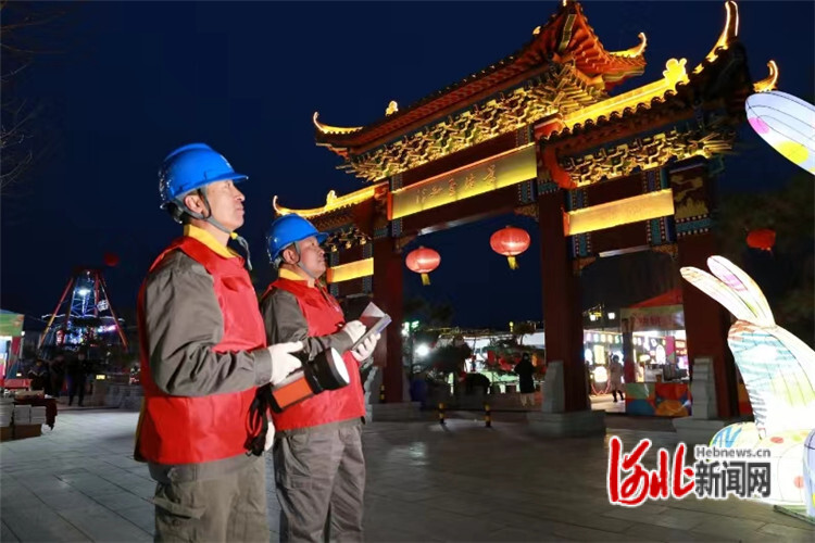 圖為國網(wǎng)廊坊供電公司“廊橋”共產(chǎn)黨員服務(wù)隊(duì)在“燈火里的永清”新春燈會現(xiàn)場巡視線路。