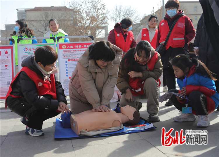3月2日,在固安縣人民廣場,紅十字會志愿者向群眾普及急救知識。通訊員門叢碩攝