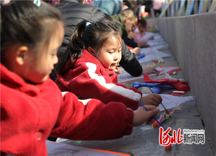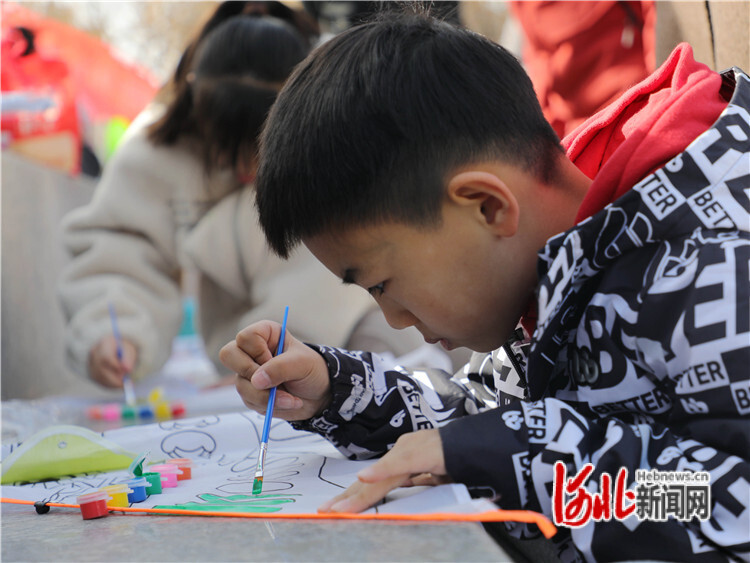 3月17日,在固安縣迎賓公園廣場,小朋友正在繪制風箏。
