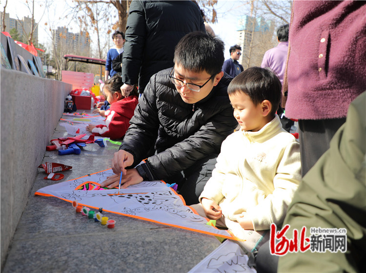 3月17日,在固安縣迎賓公園廣場,小朋友在家長的指導(dǎo)下繪制風箏。