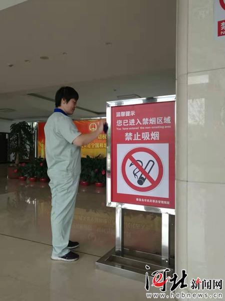 秦皇島市委機關(guān)大樓內(nèi)全面禁煙,保潔人員在擦拭一樓大廳內(nèi)的禁煙標(biāo)識。河北日報客戶端記者郭猛攝