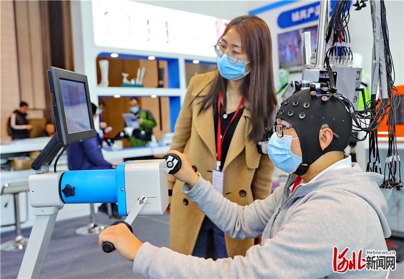 在康復(fù)輔助器具產(chǎn)業(yè)創(chuàng)新大會(huì)現(xiàn)場(chǎng),體驗(yàn)者體驗(yàn)四肢聯(lián)動(dòng)康復(fù)訓(xùn)練系統(tǒng)。河北日?qǐng)?bào)客戶(hù)端記者孫也達(dá)攝。